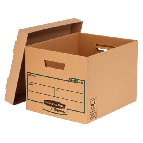 This Fellowes Earth Series heavy duty storage box features a triple layer of board to the end panels and a double layer to sides and base. It comes with reinforced hand holes that resist tearing and make these boxes comfortable to carry. Compatible with transfer files, ring binders, lever arch files and suspension files. The over-sized lid means it can also be used with suspension files. This sturdy, corrugated storage box can also be used to transport files off site or between home and work. These storage boxes are made from certified 100% recycled board and are 100% recyclable. All inks used are water based and adhesives used are solvent free.